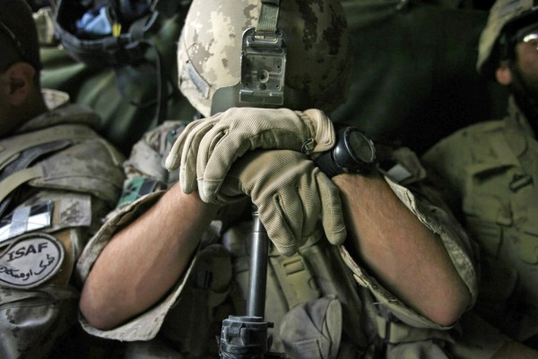 A Canadian soldier rests on the muzzle of his rifle while riding in an armoured vehicle in Kandahar province on Nov. 16, 2007. Photo: Globe and Mail