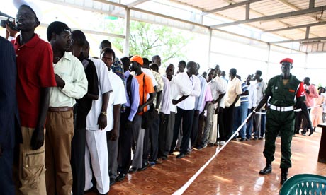Voters queue , in Juba, south Sudan, to register for the scheduled Jan. 9, 2011 southern Sudan referendum. Photograph: Phillip Dhil/EPA