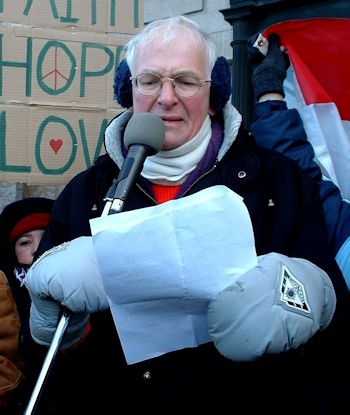 Feb. 15, 2003: Peace activist Carl Ridd addressed an anti-Iraq war rally of thousands of Winnipeggers at the Manitoba Legislature. Photo: Glenn Michalchuk