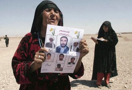 An Afghan woman on Tuesday, Sept. 9, 2008 holds a poster with photos of her family members, who were killed on August 22, 2008 during a US led raid in Azizabad village of Shindand district of Herat province. Photo: RAWA