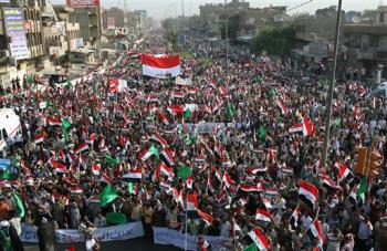 Thousands of followers of Shiite cleric Muqtada al-Sadr take part in a rally in Baghdad, Iraq, on Saturday, Oct. 18, 2008, to protest a draft U.S.-Iraqi security agreement. The mass show of opposition comes as the United States and Iraqi leaders try to build support for the accord that would extend the presence of American forces in Iraq beyond the end of this year. (AP Photo/Hadi Mizban)