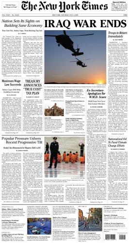 Dated July 4 2009, and boasting the front-page motto: “All the news we hope to print” in a twist on the daily’s famous phrase “All the news that’s fit to print”, the fake paper looks forward to the day the war ends, and envisages a chain of events that would be manna from heaven for American liberals.