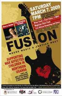 FUSION is an event that will raise money and awareness for war affected children in Northern Uganda. Enjoy performances by Sierra Noble, The Shouting Ground, magician Chris Funk, WHY and live African drums and dance. Visit artisan tables and buy their work.