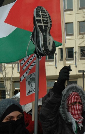 Winnipeg, Jan. 10, 2009: Demonstrators protesting the Israeli invasion of Gaza. The shoe has become a symbol of resistance. Photo: Paul GrahamPeace Alliance Winnipeg encourages you to donate an old shoe to this campaign. You can include a note which will be posted on the wall of shame. If you bring your shoes to our March 7th human rights forum, Defending Human Rights in a post-9/11 World, we will ship them on your behalf.