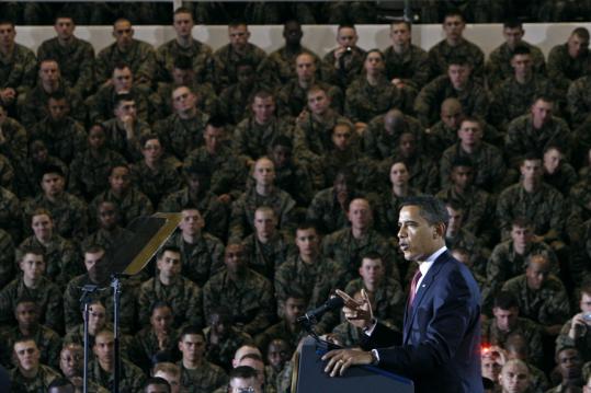 President Obama spoke to Marines at Camp Lejeune, N.C., where President Bush in 2003 rallied support for the war. (Jim Young/Reuters)