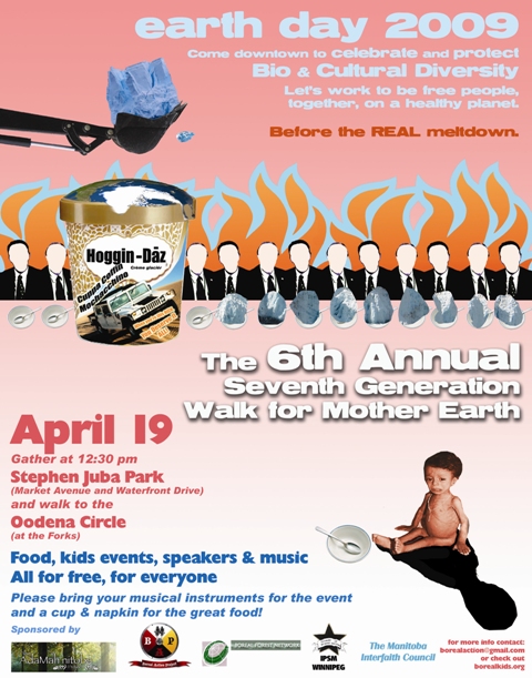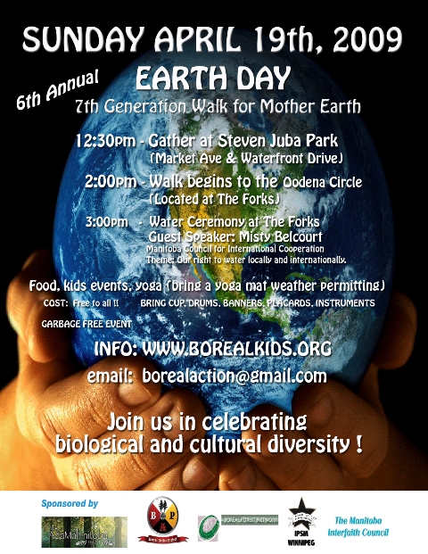 3:00 PM and on – activities at the Forks’ Oodeena Circle, Includeing water ceremony, children’s activities, short speeches, including guest speaker Misty Belcourt of Manitoba Council for International Cooperation speaking on water rights at home and abroad, free food, and a generally nice time in celebration of life on this planet Earth, our only home.