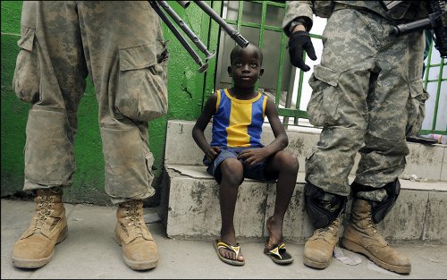 Jan. 20, 2010: A young boy keeps his eyes on soldiers of the U.S. 82 Airborne Division outside the general hospital in Port-au-Prince, Haiti. Photo: Nikki Kahn-The Washington Post