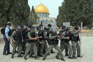 The Al Aqsa Mosque Compound, also known as Haram al-Sharif or the Noble Sanctuary, houses Al Aqsa mosque, the third holiest site in Islam. More than 200 Israeli forces and police stormed the compound early Sunday, March 7th, injuring at least 20 Palestinians who were among those protecting Al Aqsa from Jewish threats of takeover during the Jewish holiday of Purim, according to published reports. Soldiers used rubber-coated bullets and tear gas against the Palestinians. A 40-year-old woman, Fatima Al-Barsi, suffered a broken leg when Israeli soldiers attacked her as she was trying to enter the mosque, according to Maan News Agency.