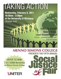 The 5th annual Social Justice Fair is offered to all University of Winnipeg students by Menno Simons College (MSC) Student Services. The Fair serves as a venue to increase student awareness of organizations working toward social justice locally and globally and to provide a platform for these organizations to meet students involved and interested in the same.