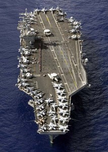 Pacific Ocean (Nov. 3, 2003) — USS Nimitz (CVN 68) crewmembers participate in a flag unfurling rehearsal with the help of family and friends on the shipÕs flight deck during a Tiger Cruise. The Nimitz Carrier Strike Group and embarked Carrier Air Wing Eleven (CVW-11) are en route to San Diego, Calif., following an eight-month deployment to the Arabian Gulf in support of Operation Iraqi Freedom. U.S. Navy photo by PhotographerÕs Mate 3rd Class Elizabeth Thompson. (RELEASED)