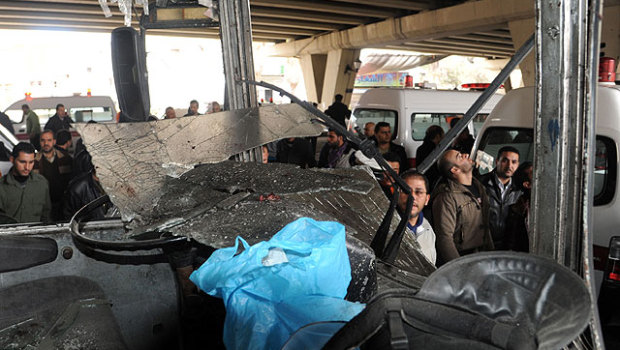 People gather at the site of a powerful explosion that hit the Midan neighborhood in the heart of Damascus on January 6, 2012 as state media said a suicide bomb attack ripped through the Syrian capital, killing or wounding “dozens.” (STR/AFP/Getty Images)