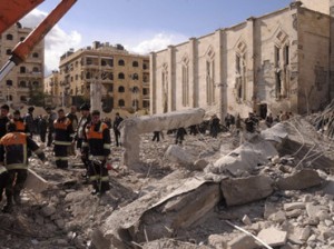 Syrian workers inspect the site of an explosion outside a military security building, one of two sites of bomb blasts in Syria’s northern city of Aleppo February 10, 2012, in this handout photograph released by Syria’s national news agency SANA. Twenty-five people were killed and 175 people were wounded in two blasts targeting security bases in Aleppo on Friday, state television quoted the Health Ministry as saying. REUTERS/SANA/Handout (SYRIA – Tags: POLITICS CIVIL UNREST) FOR EDITORIAL USE ONLY. NOT FOR SALE FOR MARKETING OR ADVERTISING CAMPAIGNS. THIS IMAGE HAS BEEN SUPPLIED BY A THIRD PARTY. IT IS DISTRIBUTED, EXACTLY AS RECEIVED BY REUTERS, AS A SERVICE TO CLIENTS