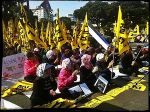 Immediately following the convention, hundreds of villagers, joined by Buddhist and Christian leaders, led a one-month march to Seoul, picking up local supporters en route. When they arrived at the capital for a giant rally (which went unreported by the Korean media), the protesters were 5,000 strong. But back home on Jeju, the government had ramped up base construction to go 24/7, forcing villagers to extend their protest vigil at the construction gate around the clock, through cold, rainy nights and continual police attacks. Thus, the Gangjeong villagers’ life-or-death battle continues. One key upcoming date is the Korean presidential election. Activists hope that if center-left candidate Moon Jae-in is elected over right-winger Park Geun-hye on December 19, the base situation will be reassessed.