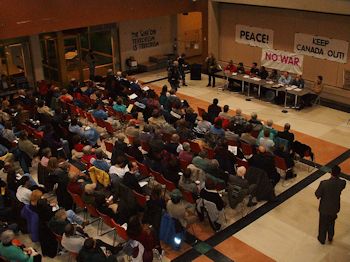 Feb. 15, 2003: Hundreds gathered at the Bulman Centre at the University of Winnipeg to discuss the pending invasion of Iraq by the United States and its allies. Photo: Glenn Michalchuk