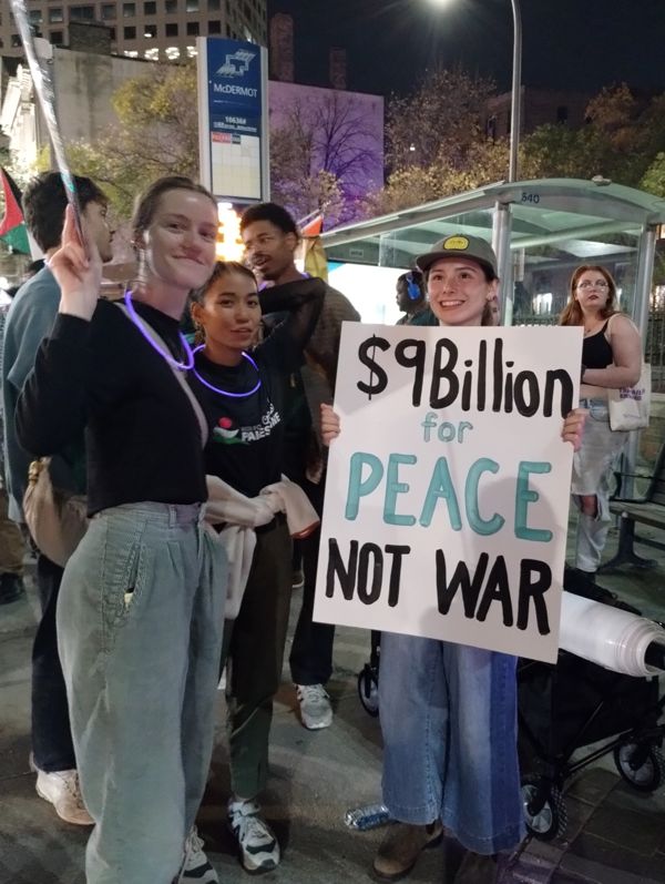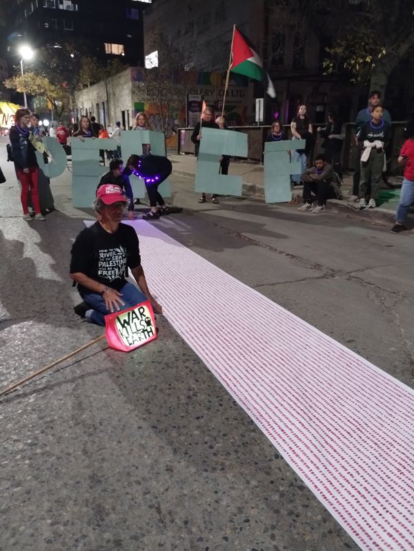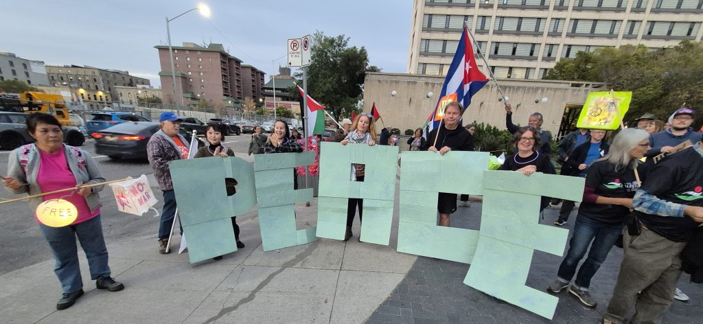 Combining art, song and poetry, about 100 people took the message of opposition to militarism and the increasing danger of war through the streets filled with people taking in the festivities of Nuit Blanche. The Walk began with Peace Alliance Executive member Sarah Borbridge speaking of the urgent need for people to organize against the militarism and war preparations of the Canadian government. She highlighted the cost to social programs and other needs that is diverted to military spending. She also spoke about the genocide in Gaza and the failure of the Canadian government to take any meaningful action on this.