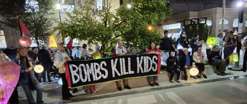 The Walk made five stops. Two featured poetry readings, one a performance of anti-war songs, at another a scroll was unrolled with marks representing those killed in Gaza, and the last stop a song against the genocide in Gaza to the tune “Sweet Caroline” was sung by participants.