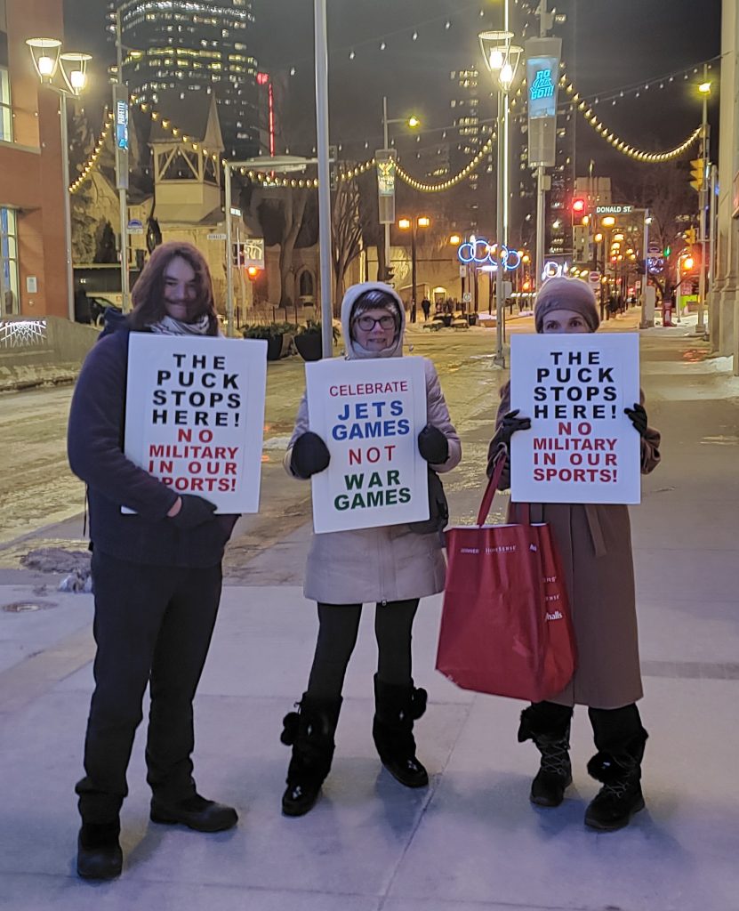 Members of the Peace Alliance Winnipeg and Mennonite Action hold an information picket to protest the Winnipeg Jets hockey club’s annual Canadian Armed Forces Appreciation Night. While at the game, they handed out leaflets urging the Winnipeg Jets and the True North organization to cut ties with the Canadian Armed Forces, stop glorifying war and support democratic participation, climate action and peace. Here is a copy of their leaflet.
