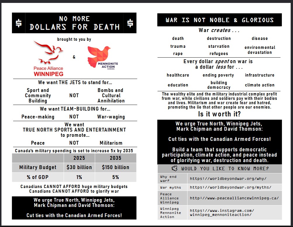 Members of the Peace Alliance Winnipeg and Mennonite Action hold an information picket to protest the Winnipeg Jets hockey club’s annual Canadian Armed Forces Appreciation Night. While at the game, they handed out leaflets urging the Winnipeg Jets and the True North organization to cut ties with the Canadian Armed Forces, stop glorifying war and support democratic participation, climate action and peace. Here is a copy of their leaflet.