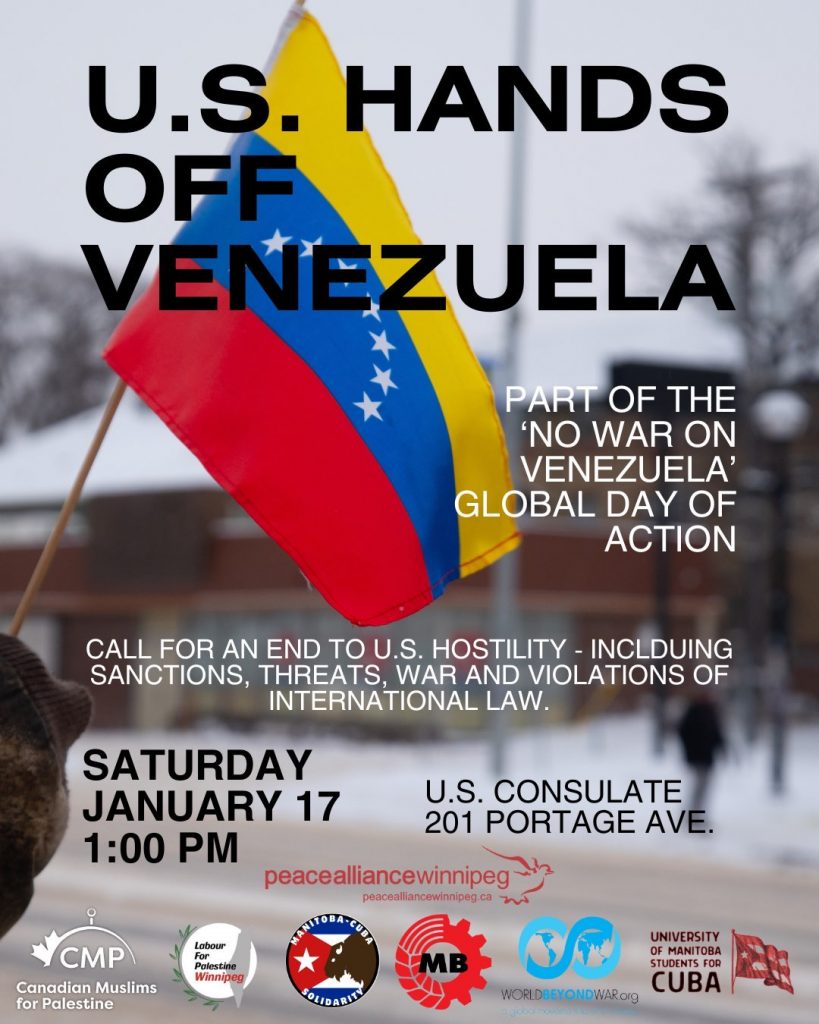 Jan. 17, 2026: Winnipeggers rallied in front of the building that houses the United States Consulate to voice opposition to US military and economic attacks on Venezuela and other Latin American countries. The action, which was part of an international day of action, was organized by Peace Alliance Winnipeg and endorsed by Canadian Muslims for Palestine, Labour for Palestine (Winnipeg), Manitoba-Cuba Solidarity, Communist Party of Canada (Manitoba), World Beyond War, and University of Manitoba Students for Cuba.