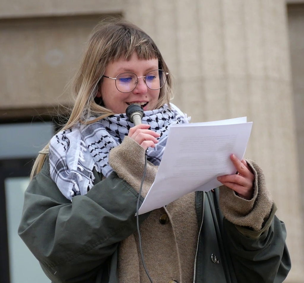 April 25, 2026: Sarah Borbridge addresses the Stop Endless War rally in Winnipeg. Photo: Paul S. Graham