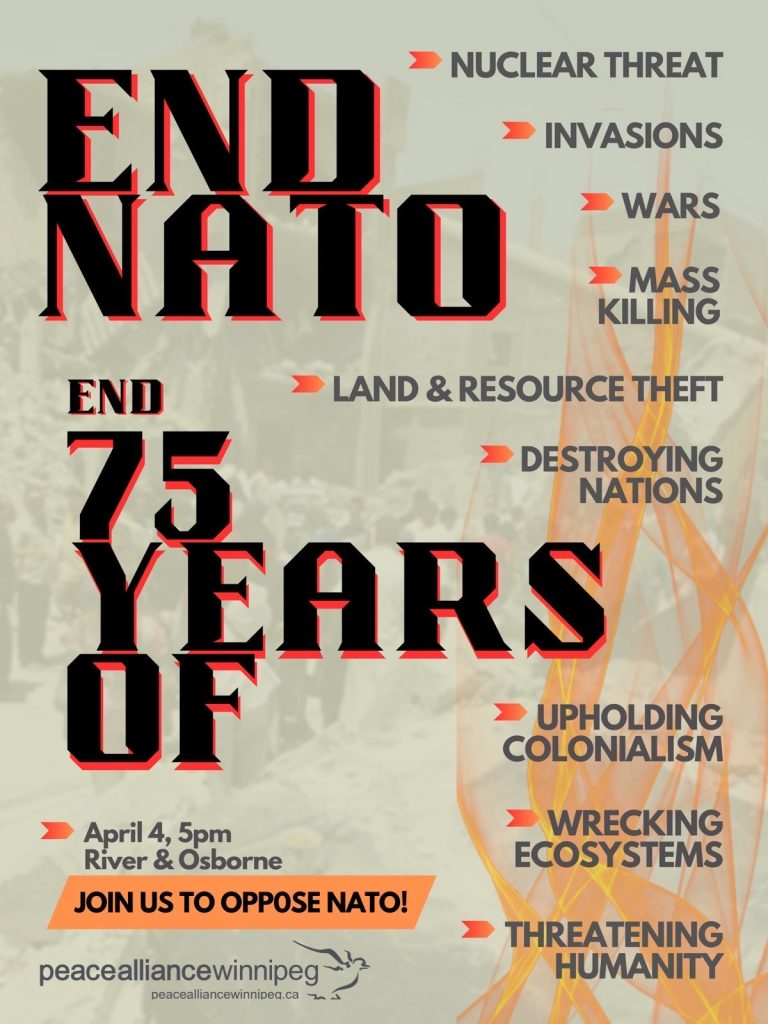 Join us on April 4th, 5pm at River and Osborne as we come together to call for the end of Canada’s involvement in the immensely destructive war machine that is NATO.