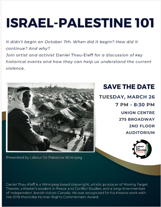 Daniel Thau-Eleff is a Winnipeg-based playwright, artistic producer of Moving Target Theatre, a Master’s student in Peace and Conflict Studies, and a long-time member of Independent Jewish Voices. He was recognized for his theatre work with the 2018 Manitoba Human Rights Commitment Award.