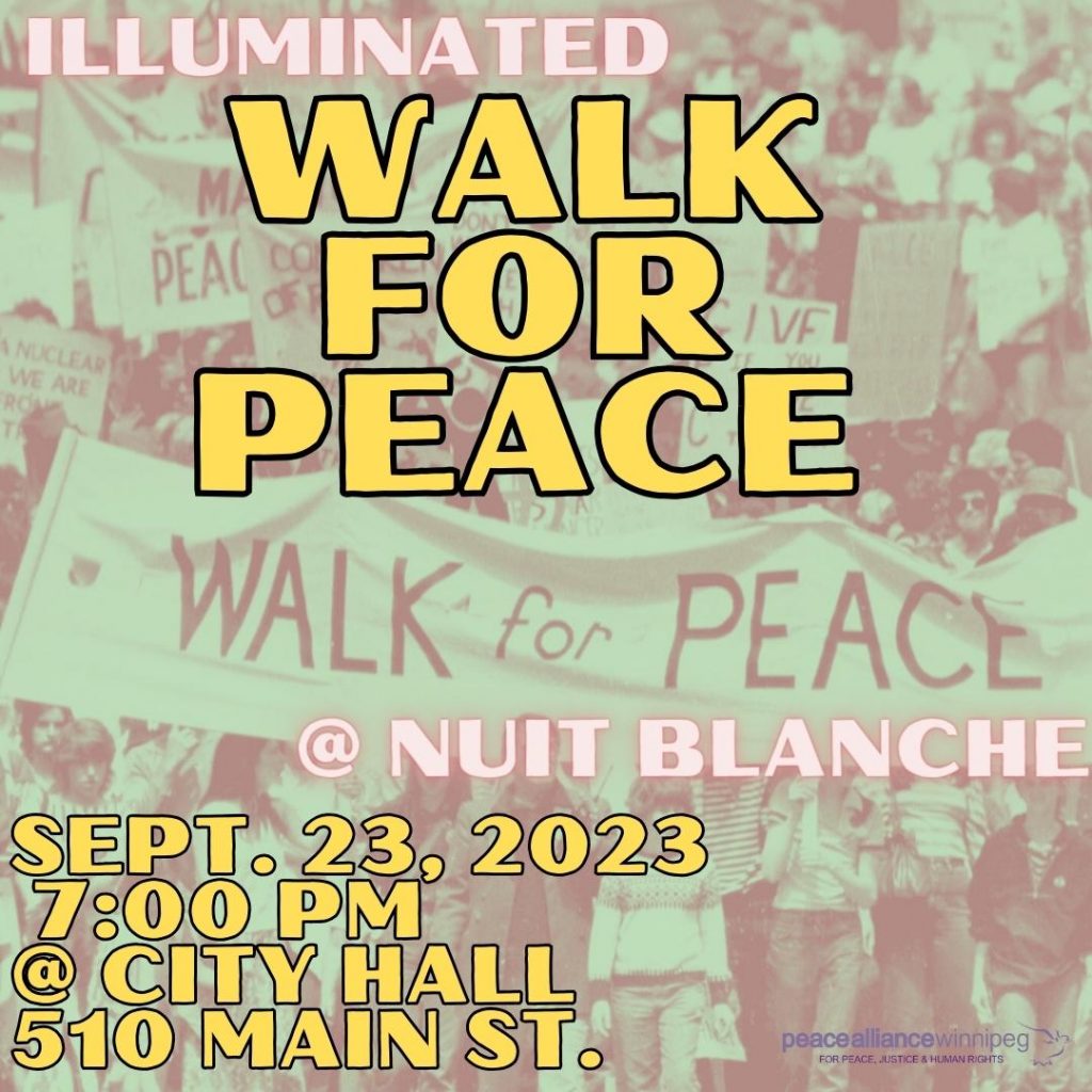7:30 pm We will hold our Walk for Peace, going from venue to venue at Nuit Blanche, with our music, our lanterns and our messages of peace.